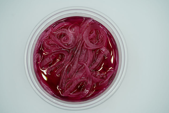 Onions fermented in beet juice. Barbeque with onions are amazing but barbeque with our Pink Onions might even be better.