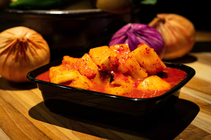 Bite sized, cubed white radish made into a crunchy Kimchi. One of the staple side dishes to have with our popular soups and stew.